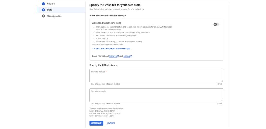 - 7. Select the Website URL data store, and fill in the website URLs to be searched and the URLs to be excluded.